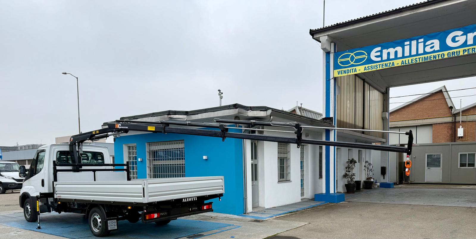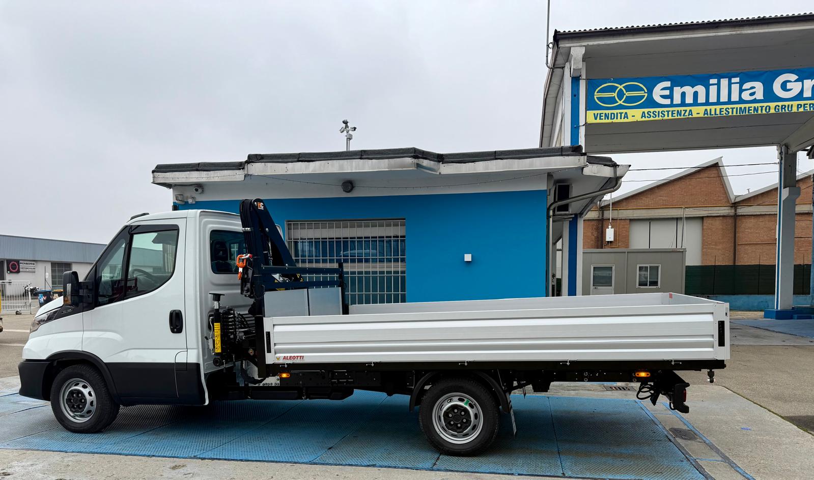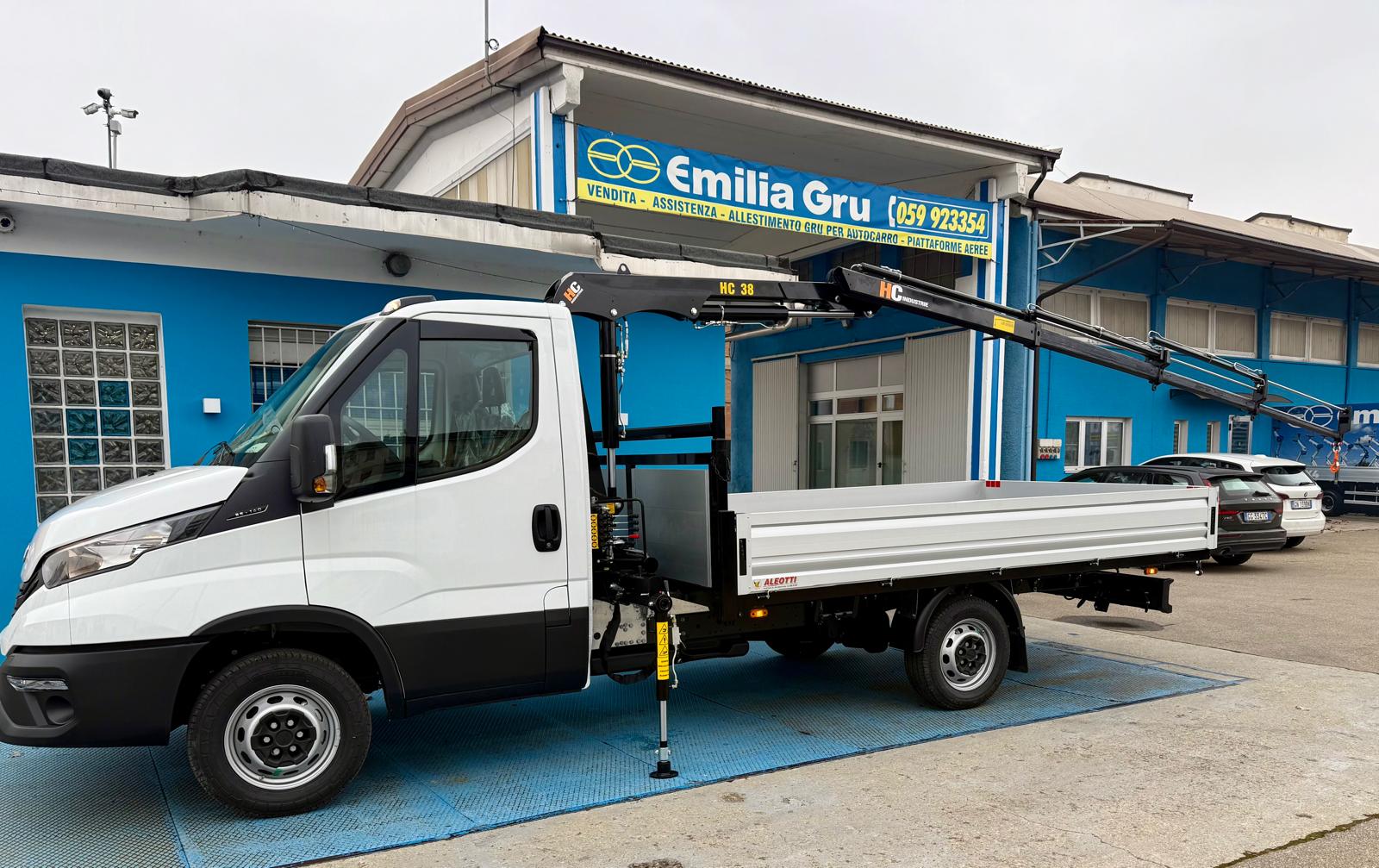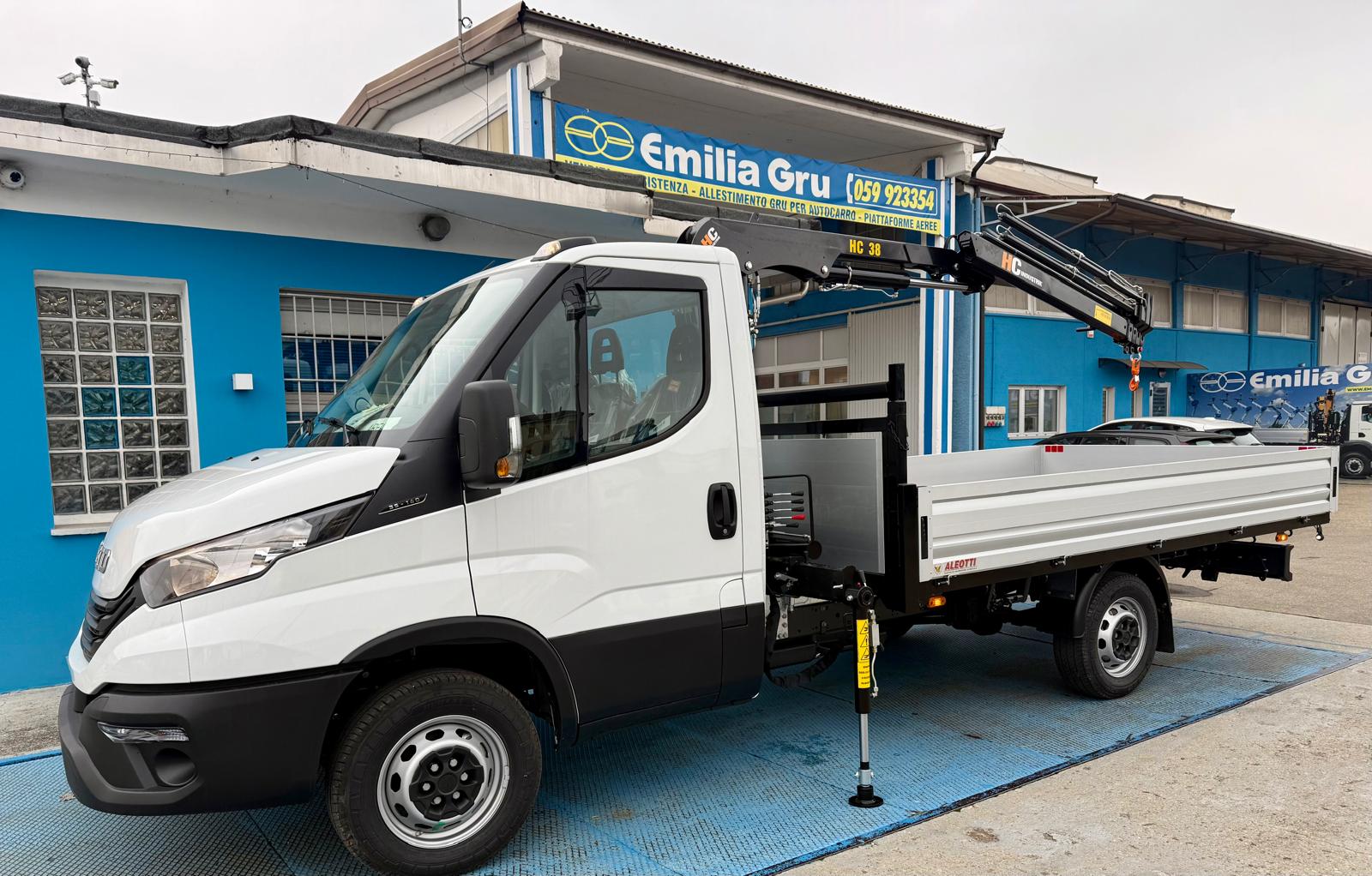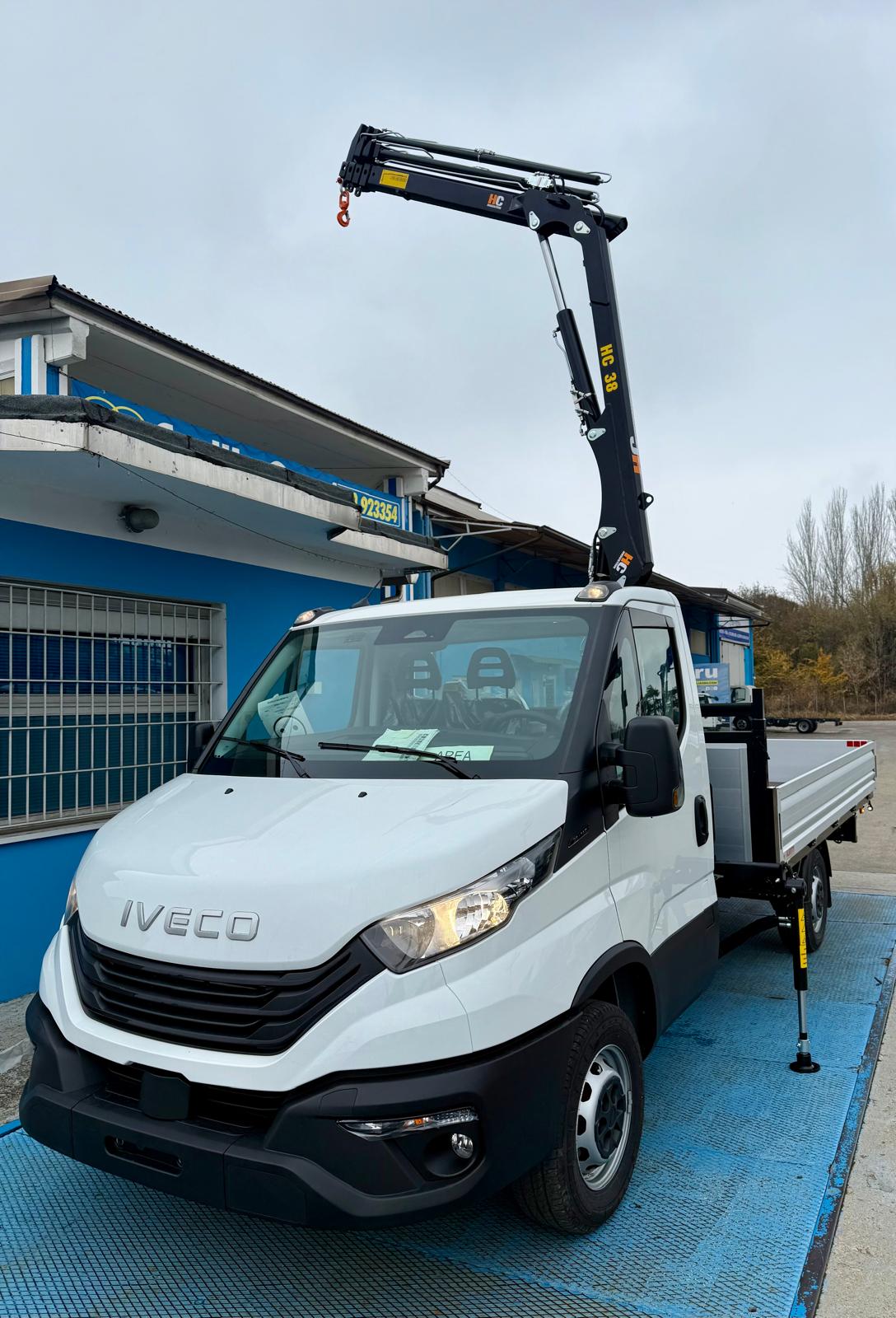 Allestito con gru HC Industrie 35XA3 a 3 sfili idraulici e cassone fisso in acciaio 3.800 x 2.100 mm con porta pali registrabile.